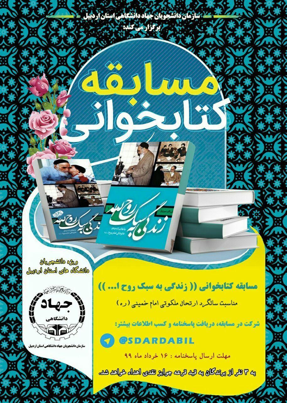 به گزارش روابط عمومی سازمان دانشجویان جهاد دانشگاهی مسابقه کتابخوانی "زندگی به سبک روح الله" به همت سازمان دانشجویان جهاددانشگاهی استان اردبیل برگزار میشود.