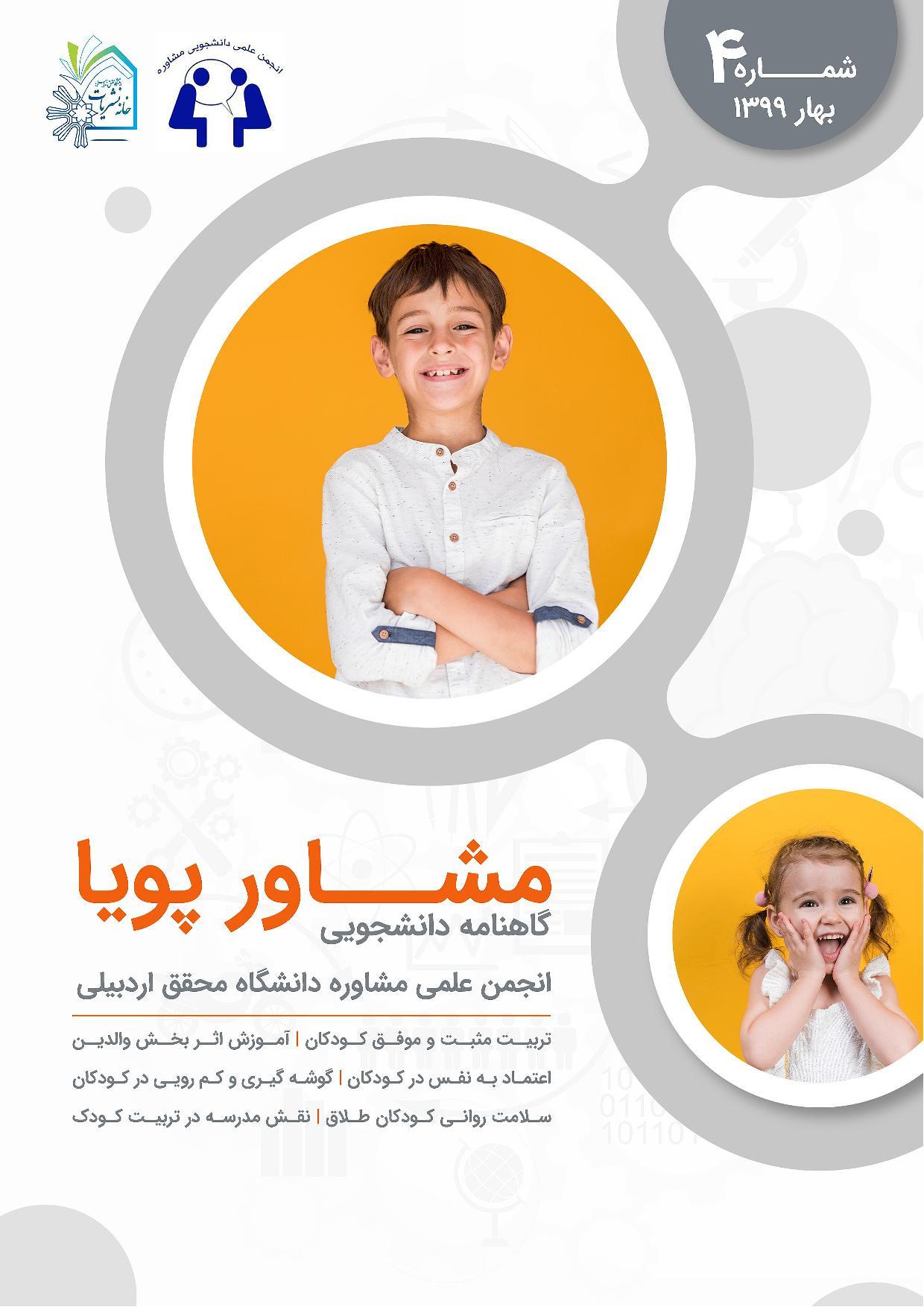 شماره چهارم «مشاور پویا» منتشر شده و به موضوعاتی از جمله تربیت مثبت و موفق کودکان، آموزش اثر بخش والدین، اعتماد به نفس در کودکان، گوشه گیری و کم رویی در کودکان، سلامت روانی کودکان طلاق، نقش مدرسه در تربیت کودک پرداخته است.