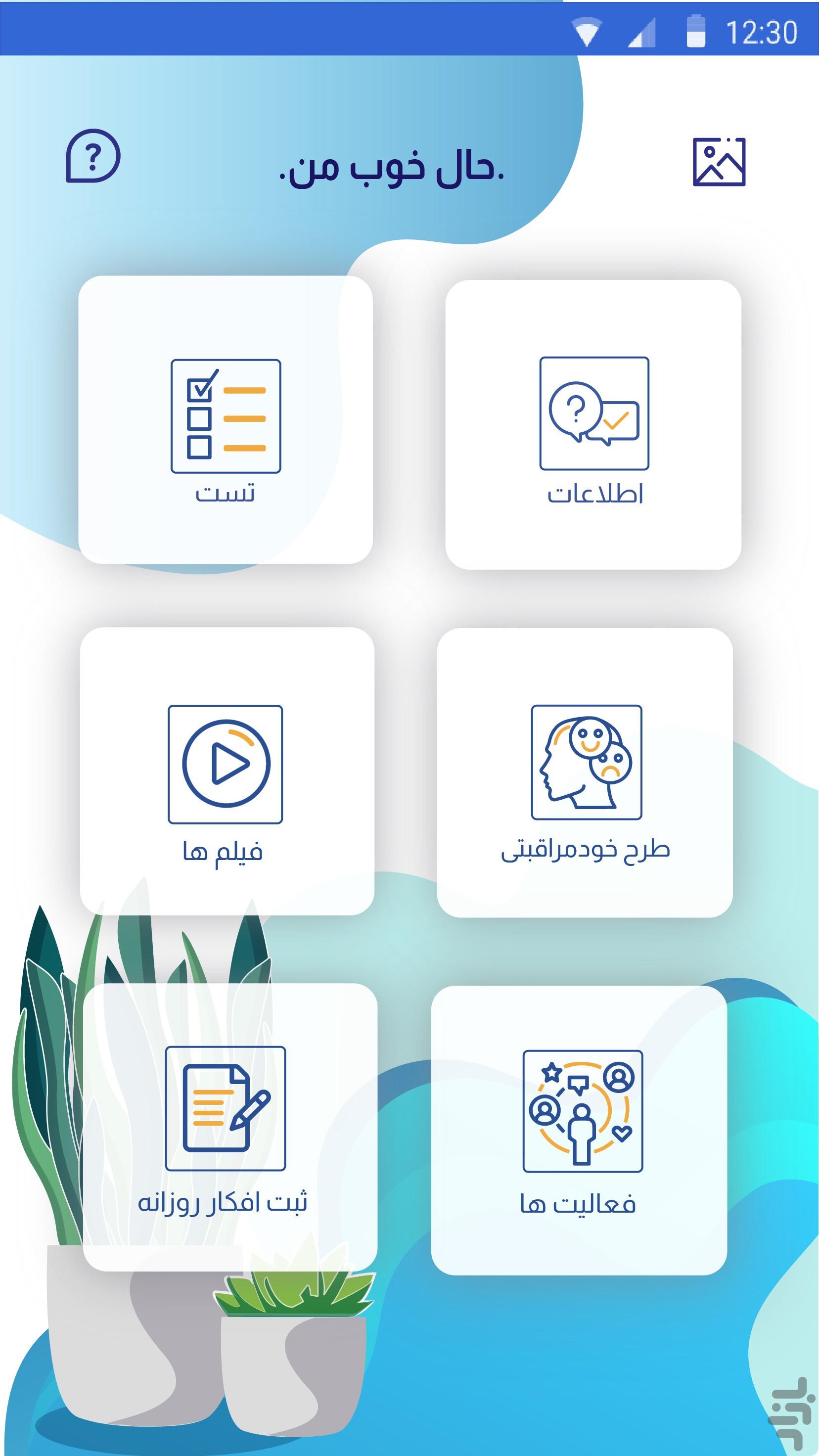 در ابتدا که وارد اپلیکیشن میشوید با فضایی که شامل ۶ بخش و با رنگهای روشن و امید بخش آبی و سفید و سبزی رو به رو میشوید که حس ارامش بخشی را به شما منتقل میکند.