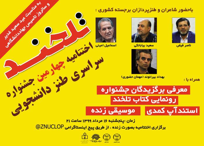 اختتامیه جشنواره سراسری تلخند پنجشنبه، ۱۶ مرداد، ساعت ۲۱ از صفحه اینستاگرام سازمان دانشجویان جهاد دانشگاهی واحد زنجان به آدرس @znuclop پخش خواهد شد.