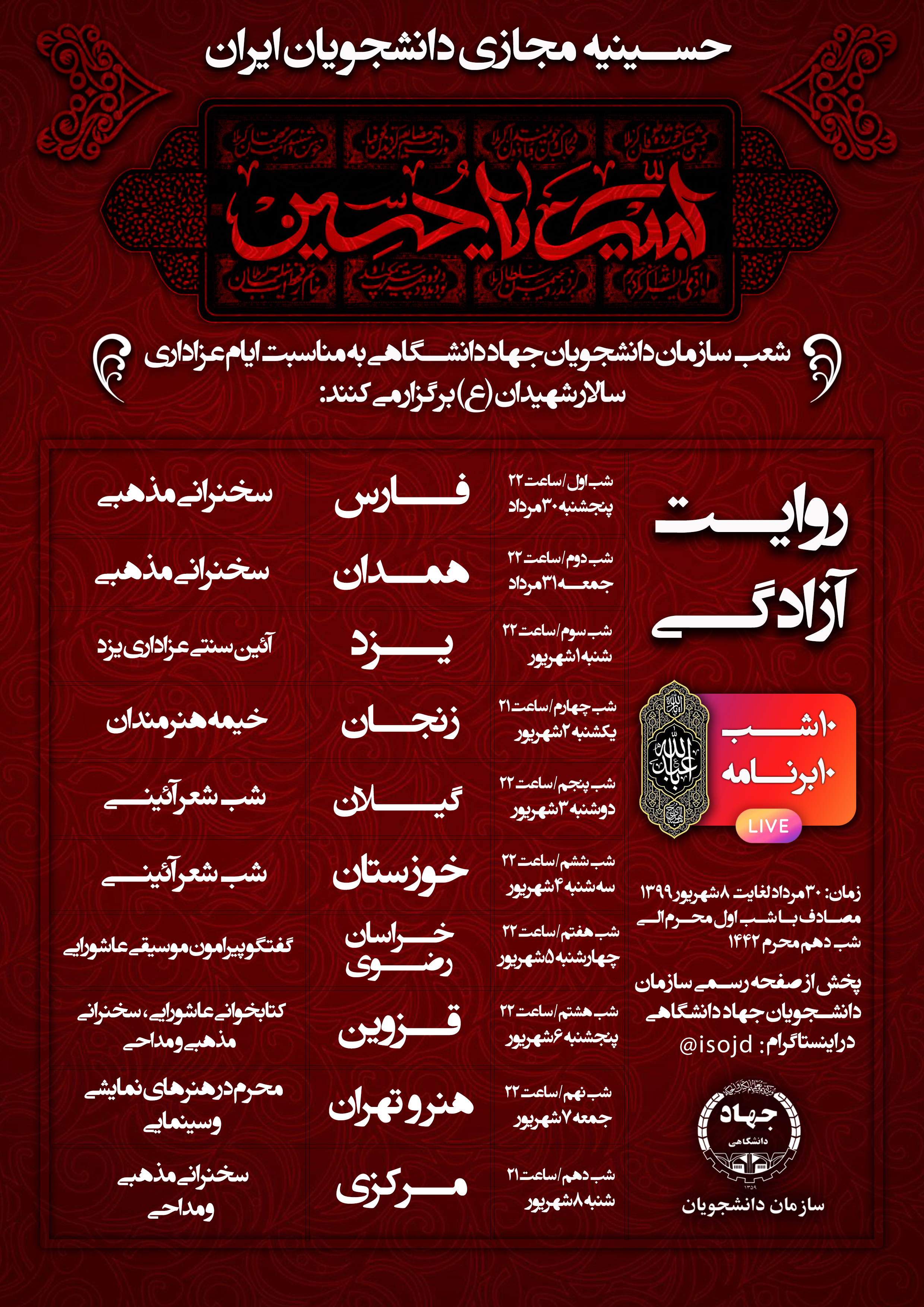 وی تصریح کرد: در شب اول و دوم ماه محرم، شعب استان فارس و همدان با پخش "سخنرانی مذهبی"، شب سوم شعبه یزد با بررسی "آئین سنتی عزاداری" و شب چهارم شعبه زنجان با ویژه برنامه "خیمه هنرمندان" میزبان دانشجویان و عاشقان اباعبدالله خواهند بود.