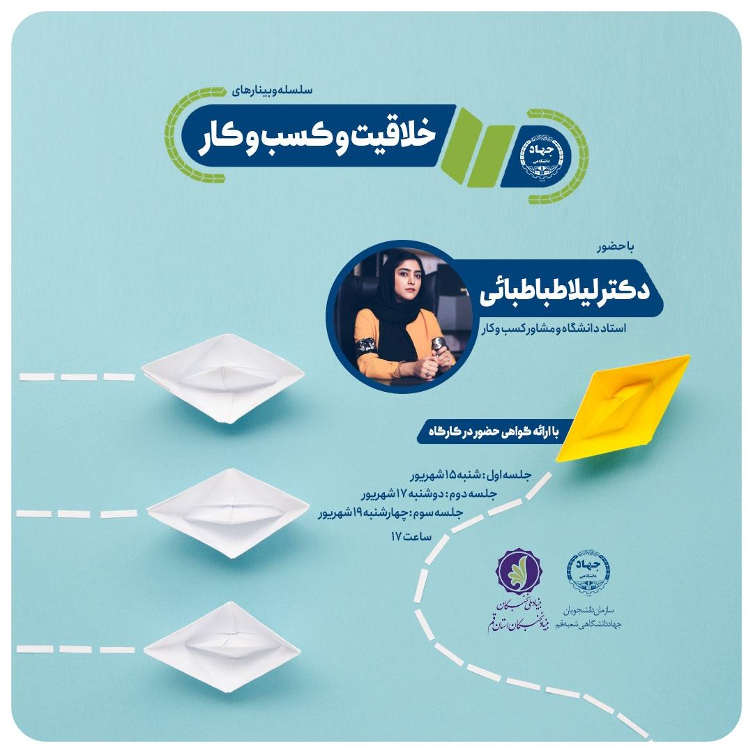 به گزارش روابط عمومی سازمان دانشجویان جهاد دانشگاهی، وبینارهای خلاقیت کسب و کار با حضور دکتر طباطبایی استاد دانشگاه و مشاوره کسب و کار، در سازمان دانشجویان استان قم برگزار می گردد.