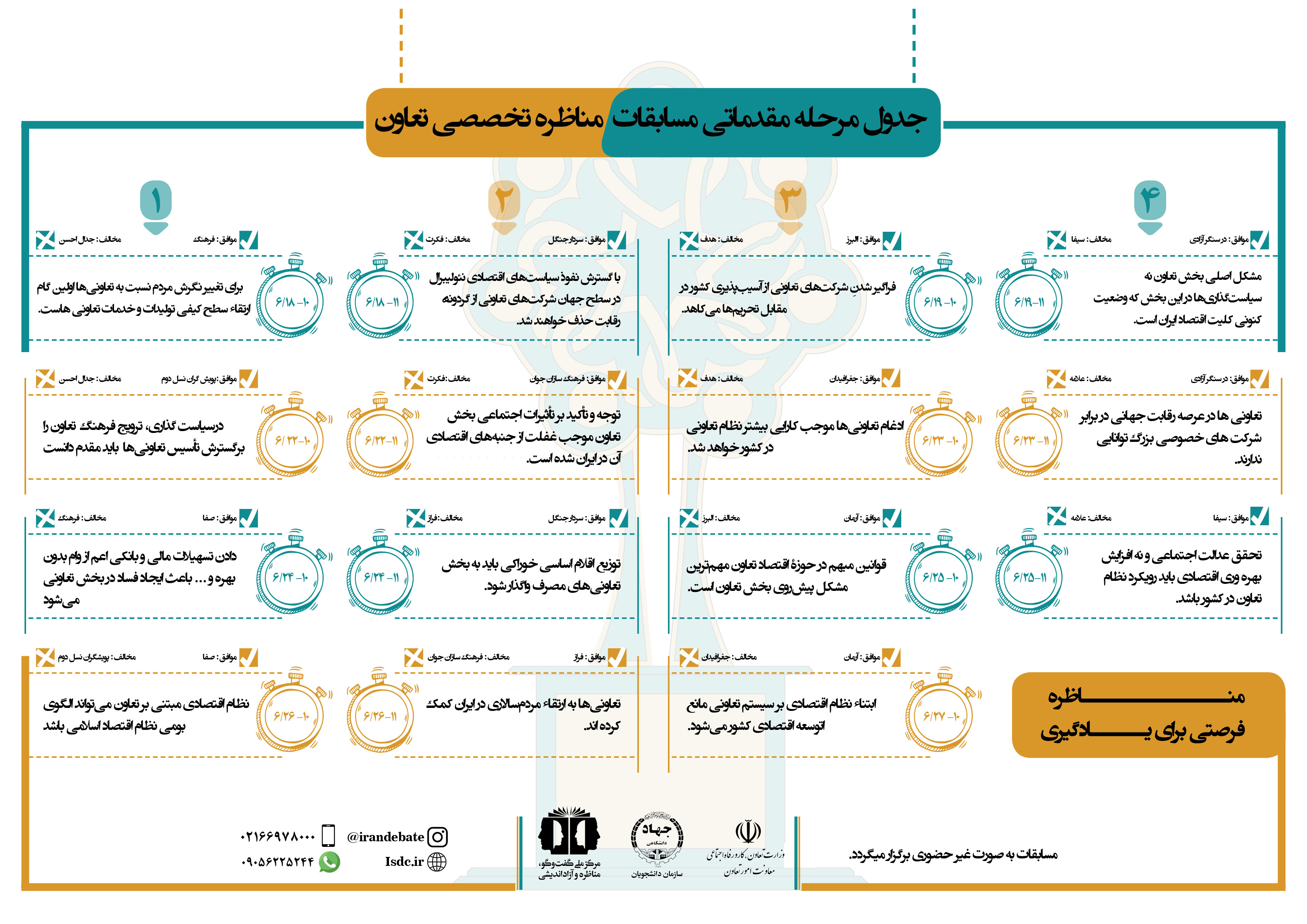 "دادن تسهیلات مالی و بانکی اعم از وام بدون بهره و.. باعث ایجاد فساد در بخش تعاونی میشود."، " فراگیر شدنِ شرکتهای تعاونی از آسیبپذیری کشور در مقابل تحریمها میکاهد."، "بهترین روش مهار انحصار طلبی شرکتهای خصوصی بزرگ گسترش تعاونیهاست."، " توزیع اقلام اساسی خوراکی باید به بخش تعاونیهای مصرف واگذار شود." و "تعاونیها به ارتقاء مردمسالاری در ایران کمک کرده اند" از جمله گزارههایی است که تیمهای شرکت کننده در دو موضع موافق و مخالف به بحث خواهند گذاشت.