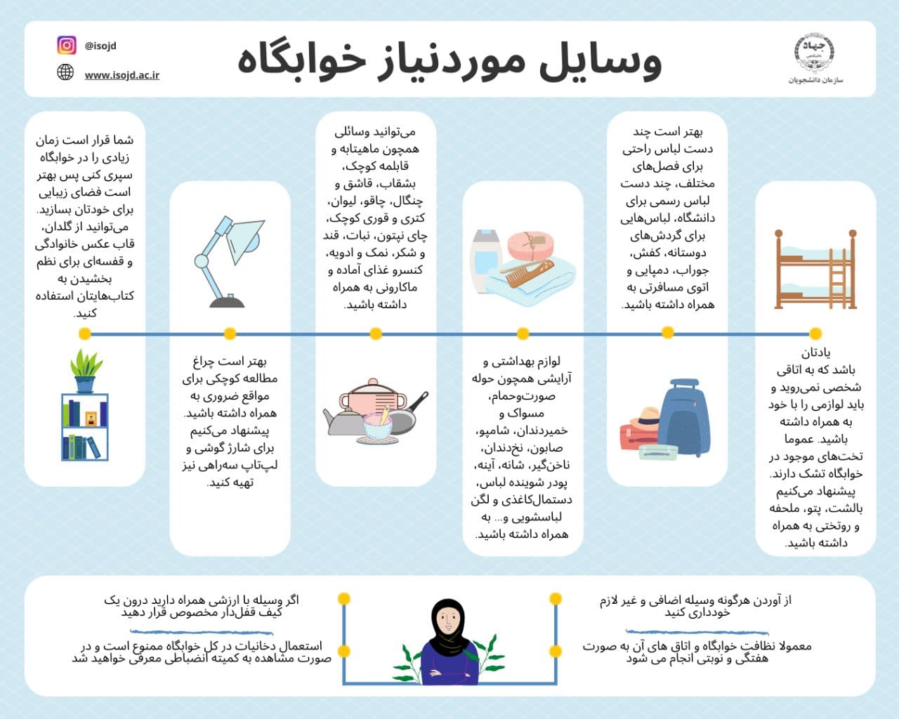 بالش، پتو و ملحفه و روتختی ازجمله وسایل موردِ نیاز دانشجویان برای اسکان در خوابگاه است.