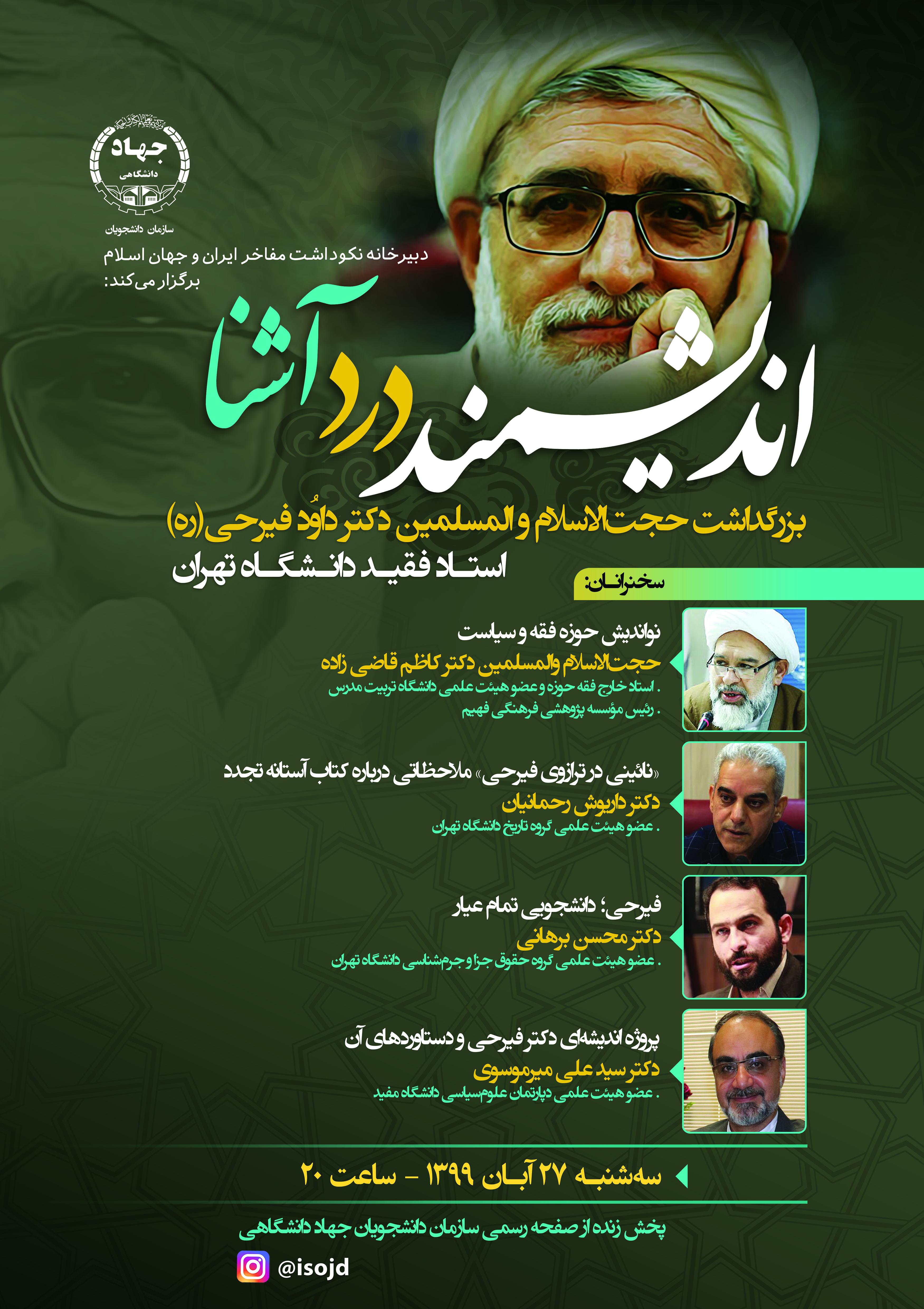 همچنین در ادامه این نشست که بهصورت زنده از صفحه رسمی سازمان دانشجویان جهاد دانشگاهی برگزار میشود؛ دکتر محسن برهانی، عضو هیئت علمی گروه حقوق جزا و جرمشناسی دانشگاه تهران با عنوان «فیرحی؛ دانشجویی تمام عیار» و دکتر سید علی میرموسوی، عضو هیئت علمی دپارتمان علومسیاسی دانشگاه مفید درباره پروژه اندیشهای دکتر فیرحی و دستاوردهای آن مباحث خود را ارائه خواهند داد.