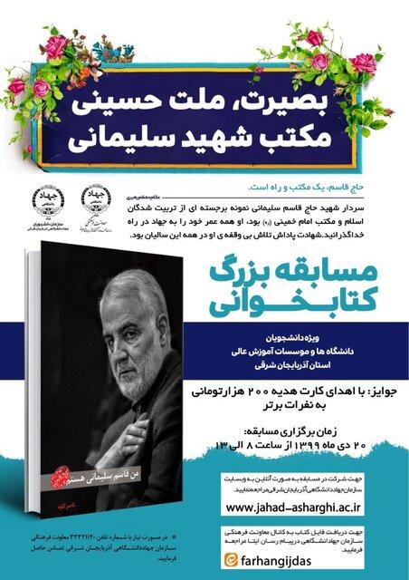 به گزارش روابط عمومی سازمان دانشجویان جهاد دانشگاهی، احد حاجی بلند با اشاره به برگزاری مسابقه بزرگ کتابخوانی، اظهار کرد: این مسابقه در ۲۰ دی ماه سال جاری از ساعت ۸ الی ۱۳ از متن کتاب "من قاسم سلیمانی هستم" برگزار میشود.