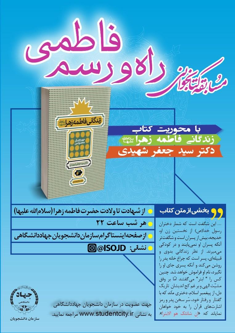 در قالب مسابقه راه و رسم فاطمی، از شب شهادت تا ولادت حضرت فاطمه (س)، طی ۲۰ شب، هرشب ساعت ۲۲ بخشی از مطالب کتاب زندگانی فاطمه زهرا (س) مرور و یک سوال مطرح میشود و از میان کسانی که به این سوالات پاسخ صحیح داده باشند، هر روز به یک دانشجو جایزه نقدی اهدا میشود.