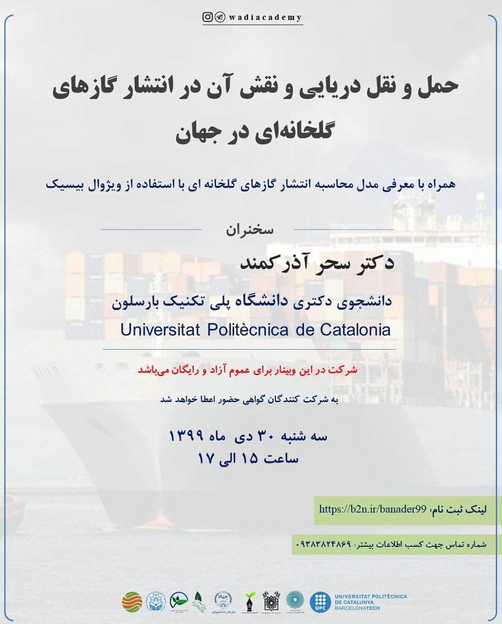 به گزارش روابط عمومی سازمان دانشجویان جهاددانشگاهی وبینار علمی آموزشی با عنوان حمل و نقل دریایی و نقش آن در انتشار گازهای گلخانهای در جهان با سخنرانی سحر آذرکمند (دانشجوی دکتری دانشگاه پلی تکنیک بارسلون) ۳۰ دی ماه با حضور متخصصان، دانشجویان و علاقمندان برگزار شد.