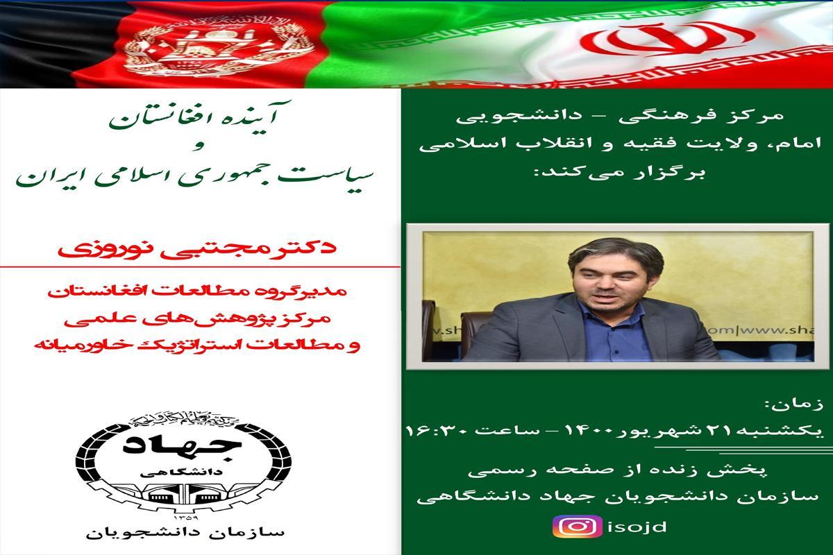 مرکز فرهنگی دانشجویی امام، ولایت فقیه و انقلاب اسلامی این نشست را با حضور دکتر مجتبی نوروزی، مدیر گروه مطالعات افغانستان مرکز پژوهش های علمی و مطالعات استراتژیک خاورمیانه، یکشنبه ۲۱ شهریور ماه ۱۴۰۰ برگزار می کند.