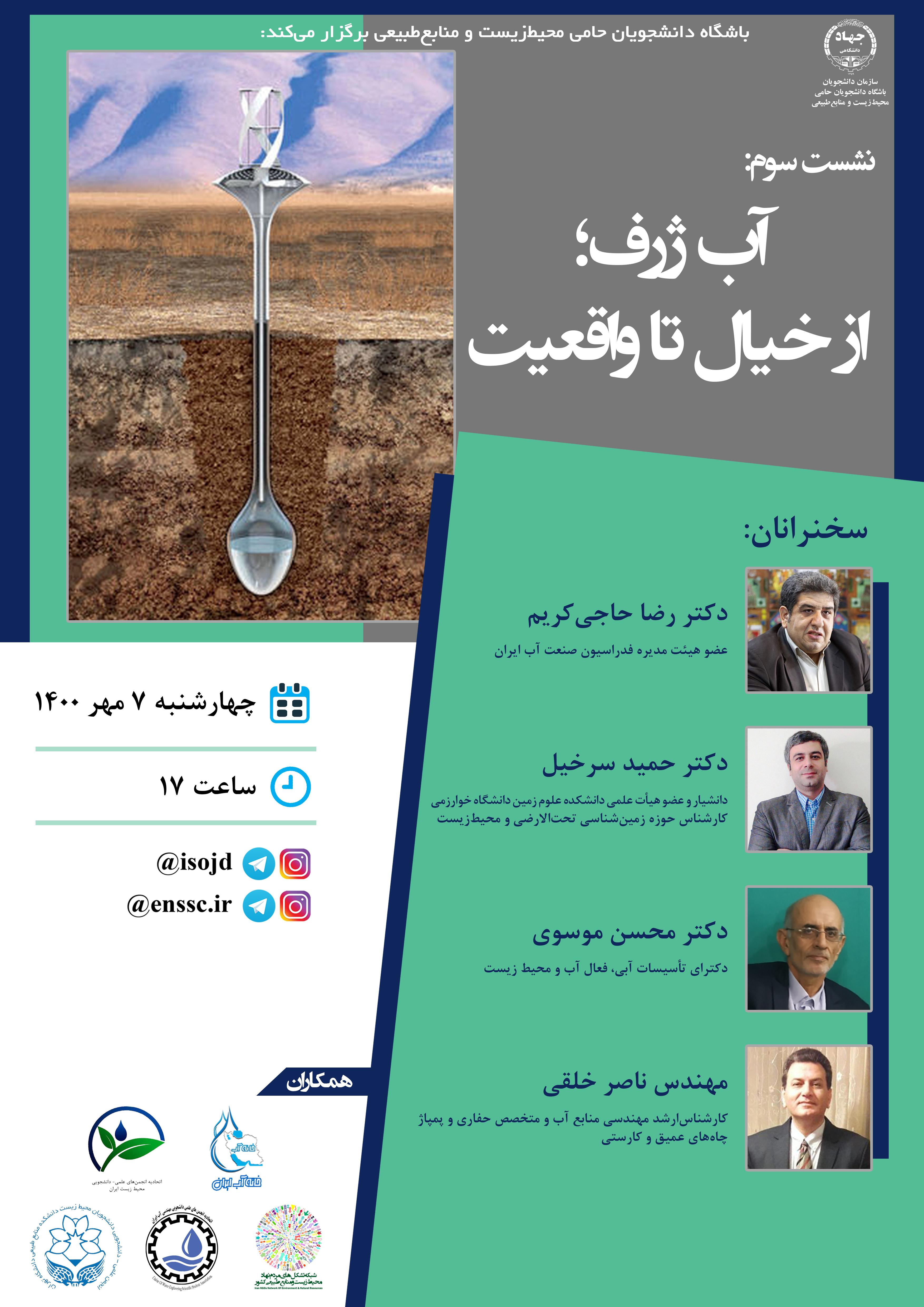 سومین نشست از سلسه نشستهای تخصصی مدیریت بحران آب در ایران با عنوان آب ژرف؛ از خیال تا واقعیت با حضور دکتر حمید سرخیل، دانشیار و عضو هیات علمی دانشکده علوم زمین دانشگاه خوارزمی و کارشناس حوزه زمین شناسی تحت الارضی و محیط زیست، دکتر رضا حاجی کریم، عضو هئیت مدیره فدراسیون صنعت آب ایران، دکتر محسن موسوی، دکترای تاسیسات آبی و فعال آب و محیط زیست و مهندس ناصر خلقی، کارشناس ارشد مهندسی منابع آب و متخصص حفاری و پمپاژ چاه¬های عمیق و کارستی چهارشنبه ۷ مهر ماه ساعت ۱۷ به صورت آنلاین برگزار خواهد شد.