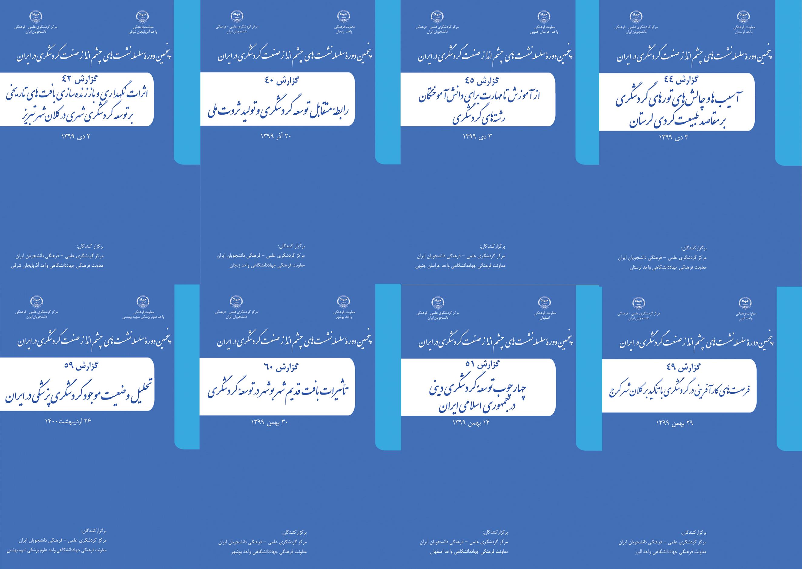 هشت گزارش از نشستهای برگزارشده با همکاری معاونتهای فرهنگی جهاددانشگاهی واحد البرز، علوم پزشکی شهید بهشتی، آذربایجان شرقی، لرستان، خراسان جنوبی، زنجان، بوشهر و اصفهان در قالب پنجمین دوره سلسله نشستهای چشم انداز صنعت گردشگری در ایران میباشد مصادف با هفته گردشگری منتشر شد.