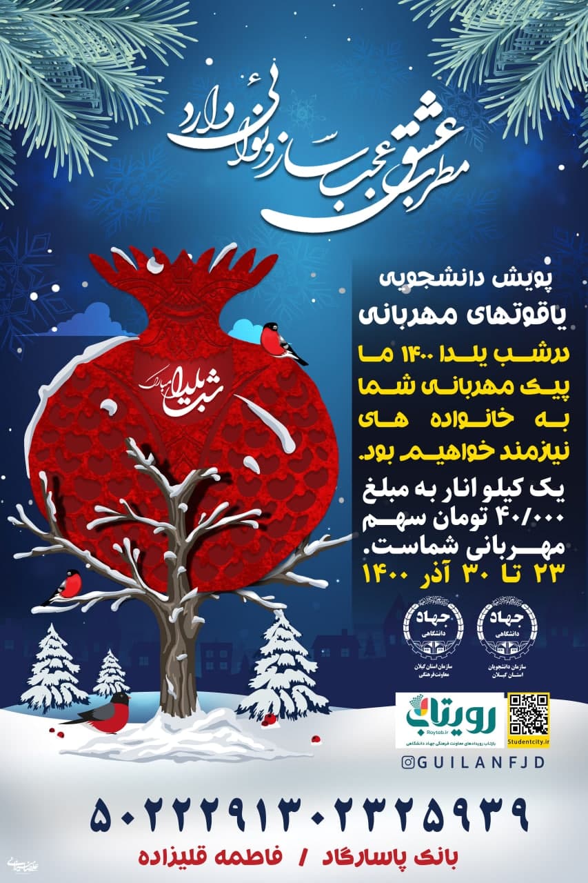 استان گیلان، پویش دانشجویی یاقوتهای مهربانی در شب یلدا را با تهیه یک کیلو انار به مبلغ ۴۰,۰۰۰ تومان برای خانوادههای نیازمند برگزار خواهد کرد.