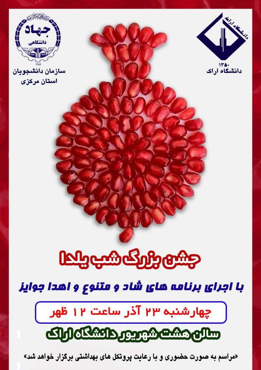 جشن بزرگ شب یلدا با اجرای برنامههای شاد و متنوع اهدای جوایز به صورت حضوری و با رعایت پروتکلهای بهداشتی، چهارشنبه ۲۳ آذرماه ساعت ۱۲ ظهر در سالن هشت شهریور دانشگاه اراک برگزار میشود. همچنین برگزاری پویش «نان و پنیر و همدلی» و اهدا بستههای شب یلدا به نیازمندان شهر از دیگر برنامههای این شعبه سازمان است.