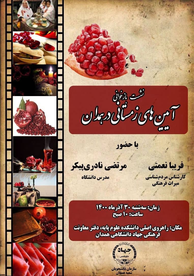 سازمان دانشجویان شعبه همدان نشست بازخوانی آئینهای زمستانی در همدان را باحضور فریبا نعمتی کارشناس مردم شناسی اداره کل میراثفرهنگی صنایعدستی و گردشگری استان همدان و مرتضی نادریپیکر مدرس دانشگاه روز سهشنبه ۳۰ آذرماه ساعت: ۱۰ برگزار مینماید.