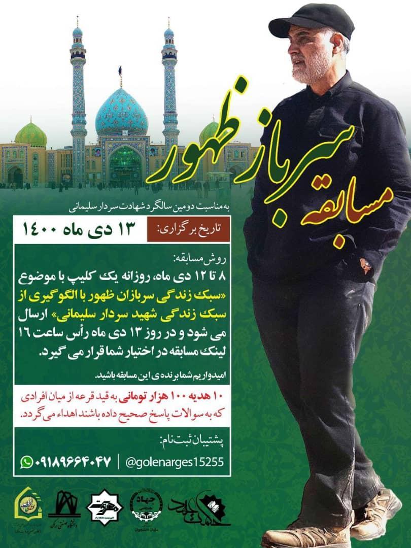 به گزارش روابط عمومی سازمان دانشجویان جهاددانشگاهی، علیرضا دارابی مدیر اجرایی سازمان دانشجویان جهاددانشگاهی استان مرکزی، اظهار کرد: به مناسبت دومین سالگرد شهادت سردار سلیمانی مسابقه «سرباز ظهور» برگزار می شود.