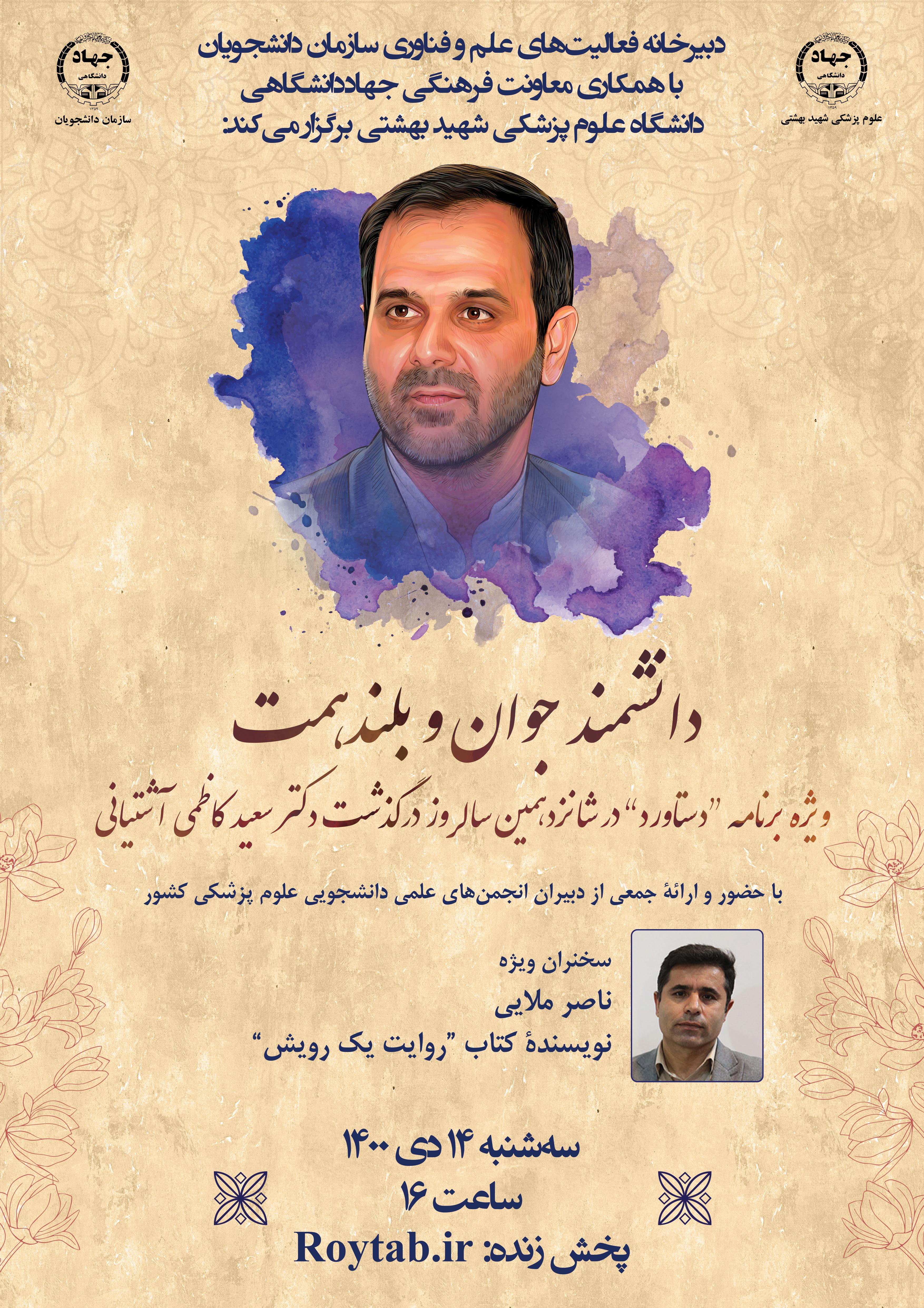 این برنامه در روز سه شنبه ۱۴ دی ماه ساعت ۱۶:۰۰ با سخنرانی ناصر ملایی نویسنده کتاب "روایت یک رویش"، حضور و ارائه جمعی از دانشجویان علوم پزشکی کشور برگزار خواهد شد.