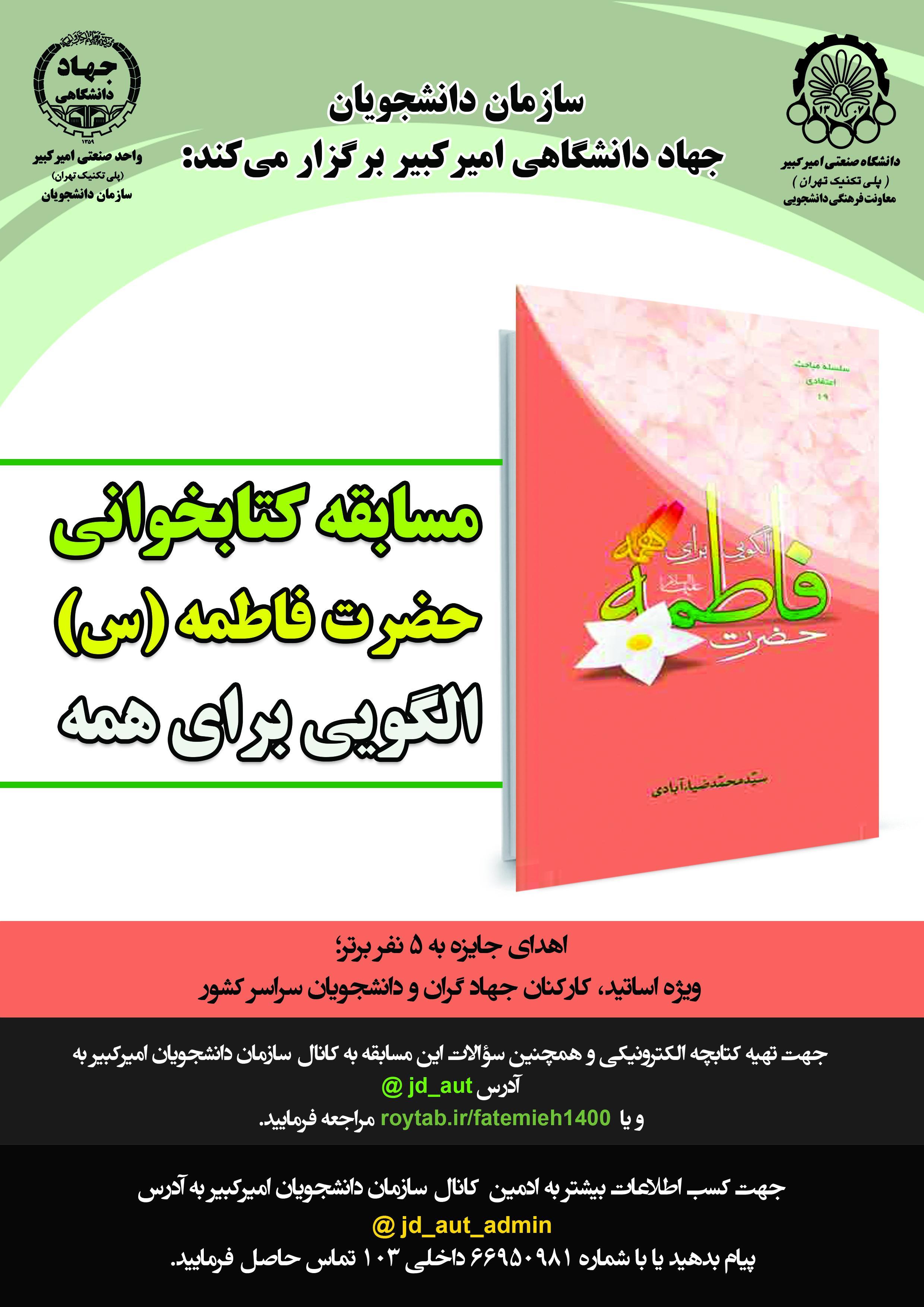 به گزارش روابط عمومی سازمان دانشجویان جهاددانشگاهی، سید علی محمدپور از برگزاری مسابقه کتابخوانی به مناسبت فرا رسیدن ایام شهادت حضرت فاطمه زهرا (سلام الله علیها) با موضوع زندگانی آن بزرگوار توسط سازمان جهاددانشگاهی واحد صنعتی امیرکبیر خبر داد.