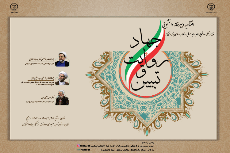 به گزارش روابط عمومی سازمان دانشجویان، این برنامه روز دوشنبه ۲۵ بهمن ماه ۱۴۰۰، از ساعت ۱۰ صبح در سالن شهید صبوری معاونت فرهنگی جهاد دانشگاهی با حضور حجت الاسلام والمسلمین دکتر روح الله شاطری، دبیر شورای اسلامی شدن دانشگاهها و مراکز آموزشی؛ حجت الاسلام و المسلمین سعید صلح میرزایی، رئیس دفتر حفظ و نشر آثار آیت الله العظمی خامنهای در قم و نویسنده کتاب «جهاد تبیین» و دکتر عباس سلیمی نمین، نویسنده و مدیر دفتر مطالعات و تدوین تاریخ ایران برگزار خواهد شد.