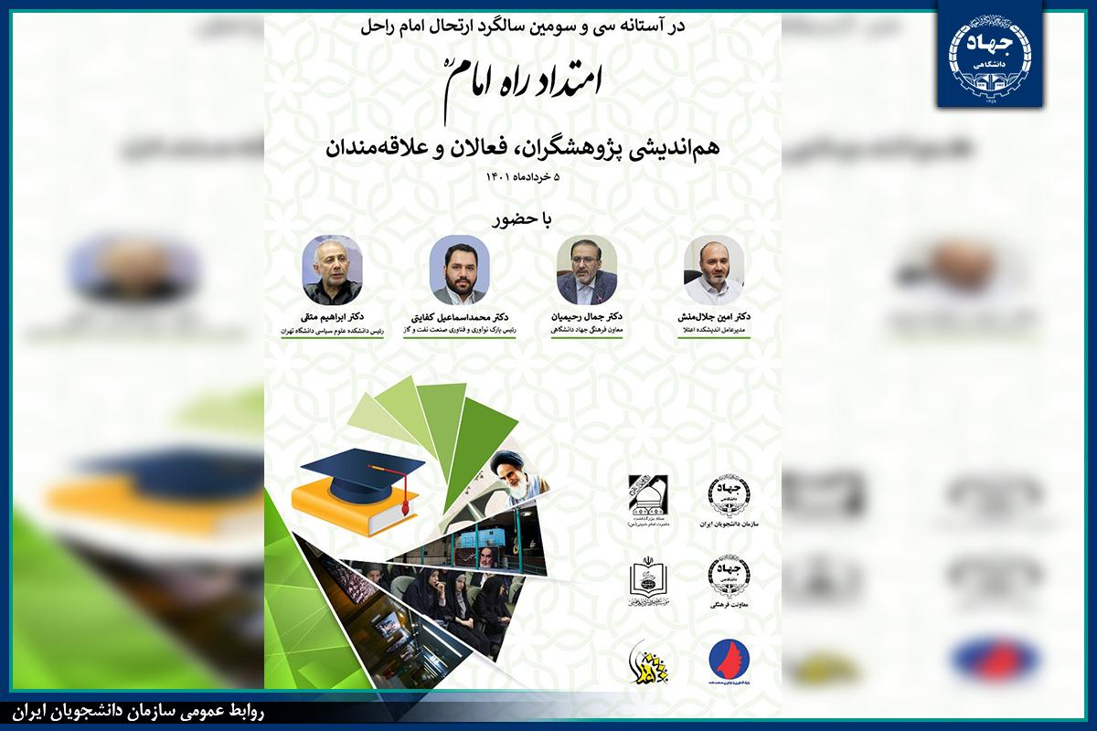 به گزارش روابط عمومی سازمان دانشجویان ایران، رضا فریدازاده سرپرست سازمان دانشجویان اظهار کرد: رویداد «امتداد راه امام» به مناسبت سی و سومین سالگرد ارتحال معمار کبیر انقلاب اسلامی به همت مرکز فرهنگی دانشجویی امام، ولایت فقیه و انقلاب اسلامی سازمان دانشجویان جهاددانشگاهی و با همکاری پارک نوآوری و فناوری صنعت نفت و گاز، مؤسسه تنظیم ونشر آثار امام خمینی (ره)، معاونت فرهنگی آستان مقدس حضرت امام خمینی (ره) و اندیشکده اعتلا برگزار میشود.