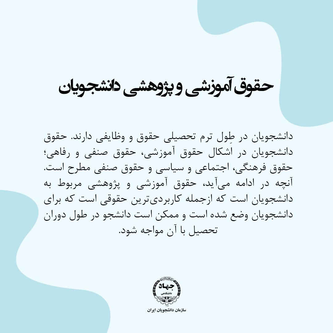 دانشجویان در طول ترم تحصیلی حقوق و وظایفی دارند. حقوق دانشجویان در اَشکال حقوق آموزشی، حقوق صنفی و رفاهی؛ حقوق فرهنگی، اجتماعی و سیاسی و حقوق صنفی مطرح است. آنچه در ادامه میآید، حقوق آموزشی و پژوهشی مربوط به دانشجویان است که ازجمله کاردبردترین حقوقی است که برای دانشجویان وضع شده است و ممکن است دانشجو در طول دوران تحصیل با آن مواجه شود.