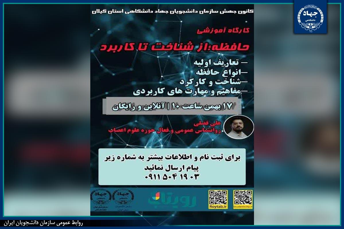 به گزارش روابط عمومی سازمان دانشجویان ایران به نقل از سازمان جهاددانشگاهی گیلان، کارگاه آموزشی «حافظه؛ از شناخت تا کاربرد» در روز ۱۷ بهمنماه توسط کانون جهش سازمان دانشجویان واحد استان گیلان و با ارائه علی فضلی، روانشناس عمومی و فعال حوزه علوم اعصاب برگزار شد.