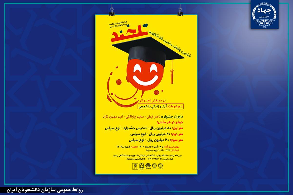 به گزارش روابط عمومی سازمان دانشجویان ایران، ششمین جشنواره سراسری طنز دانشجویی "تلخند" به همت جهاددانشگاهی استان زنجان و با همکاری سازمان دانشجویان جهاددانشگاهی، دانشگاه زنجان، حوزه هنری استان زنجان و شهرداری زنجان برگزار میشود. بخشهای این جشنواره شامل "شعر" و "نثر" است و موضوعات جشنواره شامل "موضوع آزاد" و "زندگی دانشجویی" (خوابگاه، سلف غذاخوری، امتحانات، فضای دانشگاه، شهریه و سایر موارد) می باشد.