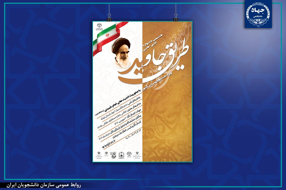 به گزارش روابط عمومی سازمان دانشجویان، در آستانه چهل و ششمین سالگرد پیروزی انقلاب اسلامی، هشتمین جشنواره ادبی- هنری «طریق جاوید» با محوریت اندیشههای امام خمینی(ره) با هدف اشاعه و ترویج اندیشه بنیانگذار انقلاب اسلامی، با مشارکت معاونت فرهنگی جهاددانشگاهی، معاونت فرهنگی، هنری و ارتباطات مؤسسه تنظیم و نشر آثار امام خمینی(ره) ، معاونت فرهنگی و اجتماعی وزارت علوم، تحقیقات و فناوری، معاونت فرهنگی و اجتماعی وزارت بهداشت درمان و آموزش پزشکی، شورای فرهنگ عمومی و نهاد نمایندگی مقام معظم رهبری(مدظله العالی) در دانشگاهها برگزار میشود.
