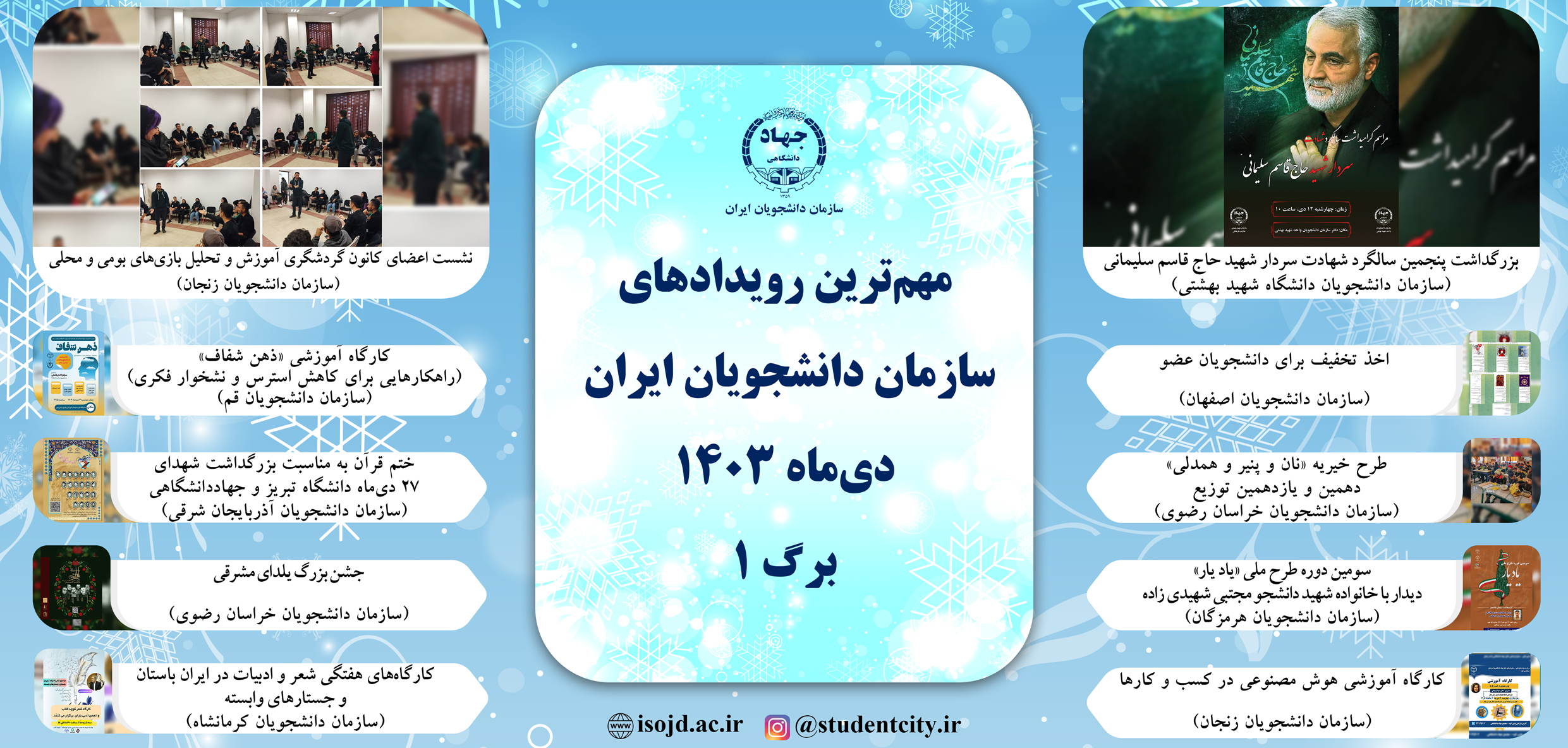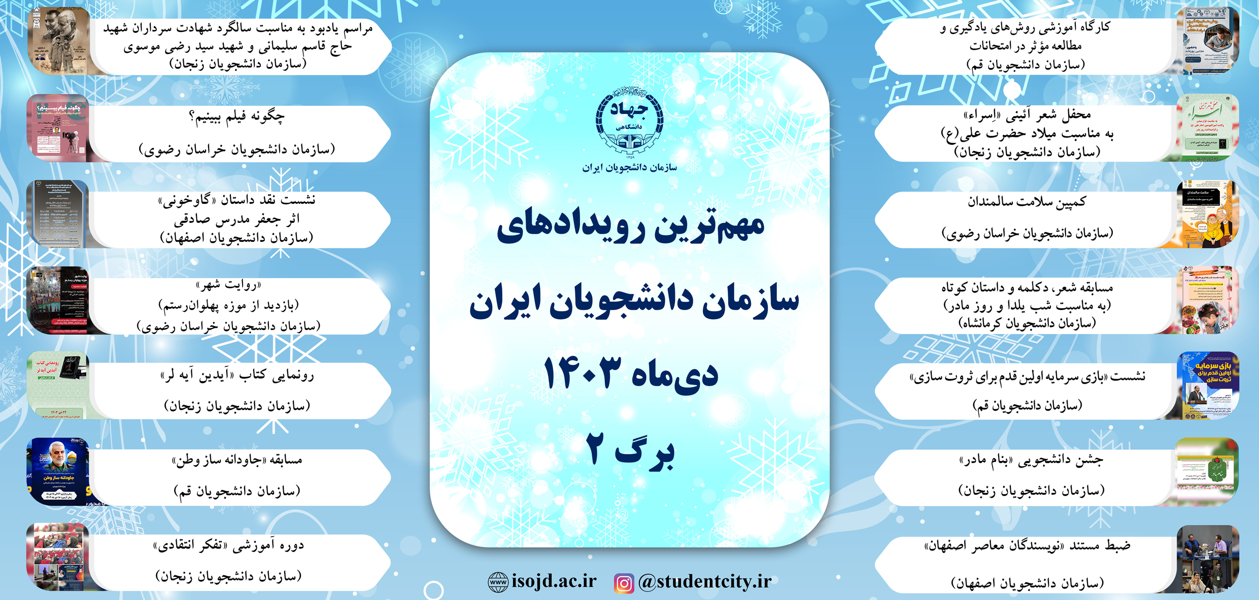 مهمترین برنامههای سازمان دانشجویان ایران در دی۱۴۰۳/ اینفوگرافیک ۲۵ اسفند ۱۴۰۳ | ۱۱:۰۴ کد : ۳۷۳۲ اخبار سازمان شُعَب سازمان دانشجویان ارسال به دیگران نام شما ایمیل شما ایمیل دریافتکننده ارسال انصراف