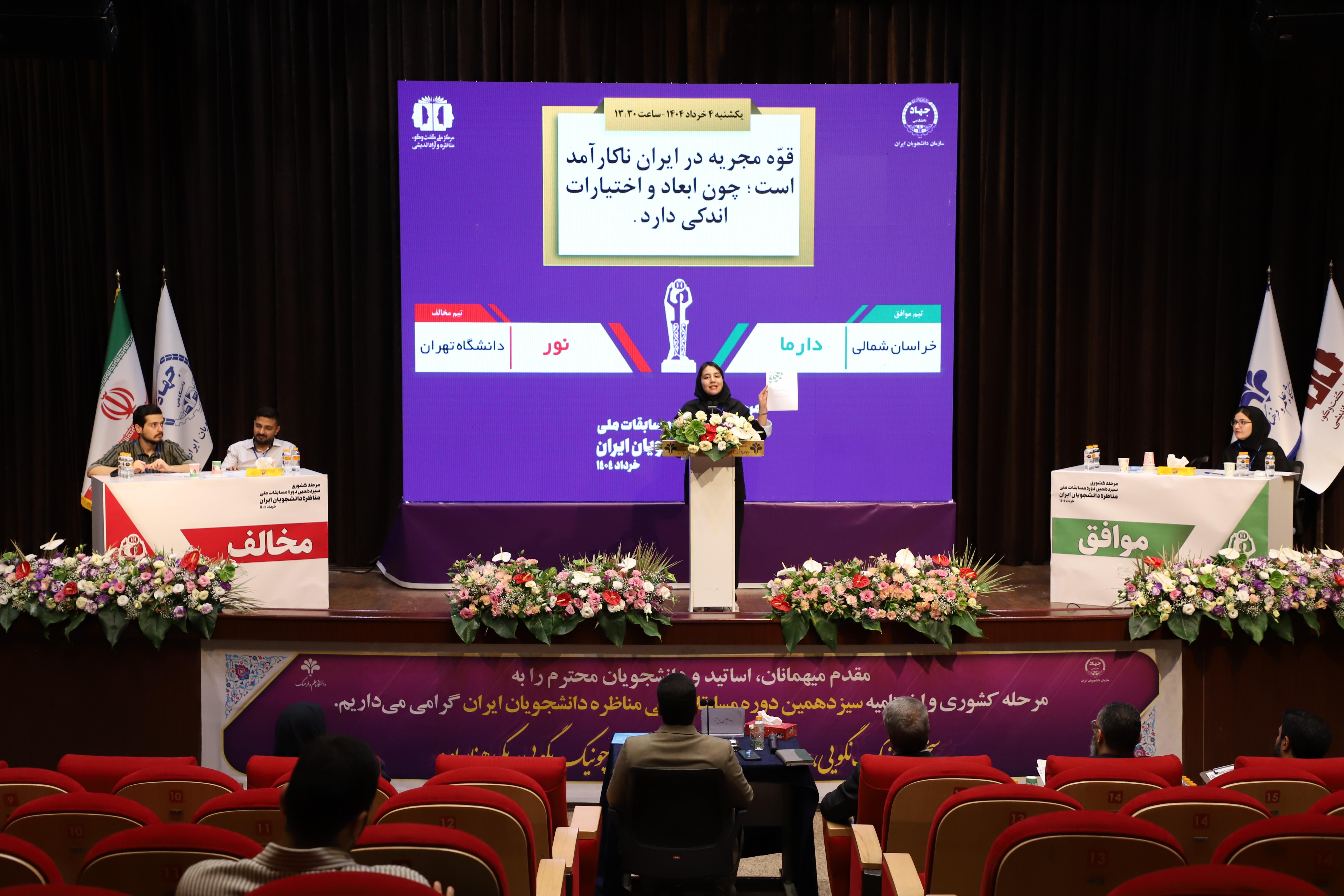 دو گروه دانشجویی «دارما» از استان خراسان شمالی و «نور» از دانشگاه تهران، صبح امروز در دانشگاه علم و فرهنگ جهاد دانشگاهی دربارۀ گزارۀ «قوه مجریه در ایران ناکارآمد است؛ چون ابعاد و اختیارات اندکی دارد» با یکدیگر به مناظره پرداختند.