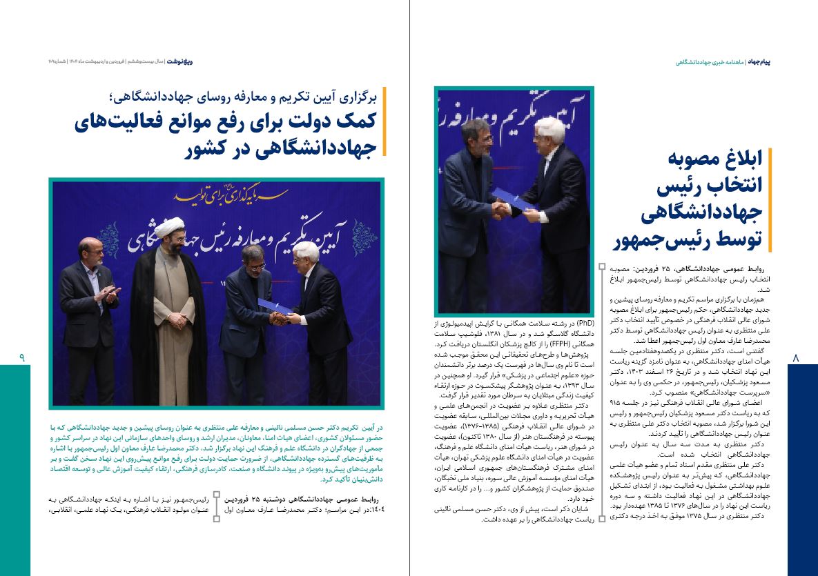به گزارش روابط عمومی جهاددانشگاهی، شماره ۲۰۹ ماهنامه «پیام جهاد» ویژه فروردین و اردیبهشت ۱۴۰۴، در بیستوششمین سال انتشار این نشریه، با نگاهی بر مهمترین اخبار و دستاوردهای جهادگران در حوزههای مختلف، بهویژه در دور تازه فعالیتهای جهاددانشگاهی پس از ابلاغ حکم ریاست دکتر علی منتظری توسط رئیسجمهور منتشر شد.