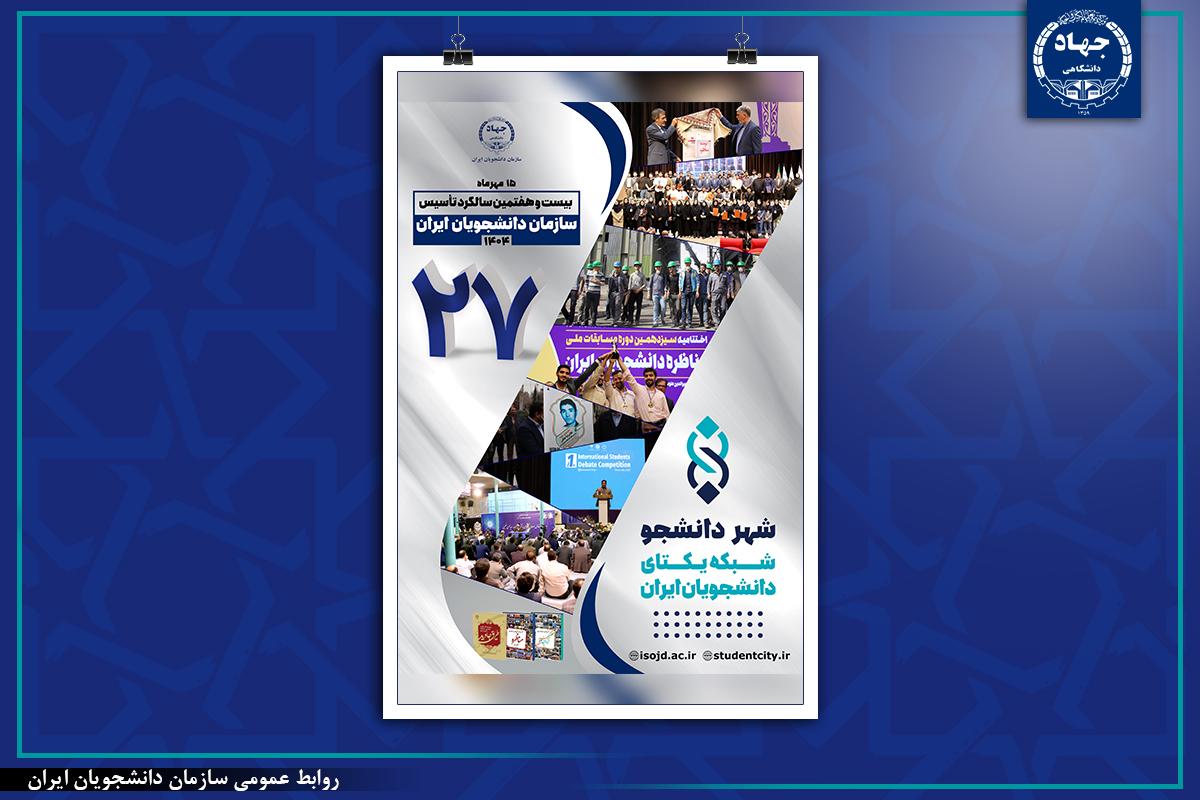 به گزارش روابط عمومی سازمان دانشجویان ایران، همزمان با بیست و هفتمین سالگرد تأسیس سازمان دانشجویان جهاددانشگاهی در روز 15 مهرماه، از پوستر سالگرد تأسیس سازمان دانشجویان جهاددانشگاهی رونمایی شد.