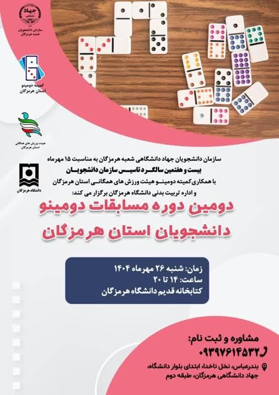 به گزارش روابط عمومی سازمان دانشجویان ایران،دومین دوره مسابقات دومینو دانشجویان استان هرمزگان به میزبانی سازمان دانشجویان جهاددانشگاهی هرمزگان و با همکاری هیئت ورزشهای همگانی استان و اداره کل تربیت بدنی استان هرمزگان برگزار شد. خانم فاطمه روزده از دانشکده ملی مهارت فاطمیه، قهرمان بخش انفرادی و تیم "خطر" دانشگاه پیام نور هرمزگان متشکل از آقایان محمدمهدی کرامتی و علیرضا کمیلی قهرمانی بخش تیمی دومین دوره مسابقات دومینو دانشجویان استان هرمزگان را از آن خود کردند.