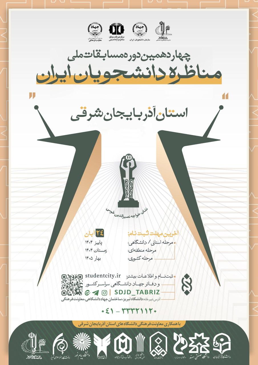 سرپرست. سازمان جهاد دانشگاهی آذربایجان شرقی زمان برگزاری مرحله استانی این مسابقات در آذربایجان شرقی را نیمه اول آذرماه سال جاری عنوان کرد وگفت: ثبت نام مرحله استانیچهاردهمیندوره مسابقات ملی مناظره دانشجویانآذربایجان شرقی ویژه کلیه دانشجویان دانشگاهها و موسسات آموزش عالی استان آذربایجان شرقی آغاز شده و تیمها میتوانند از طریق سامانه https://studentcity.ir ثبت نام کنند.مهلت ثبت نام تا ۲۵ آبان ماه جاری است.