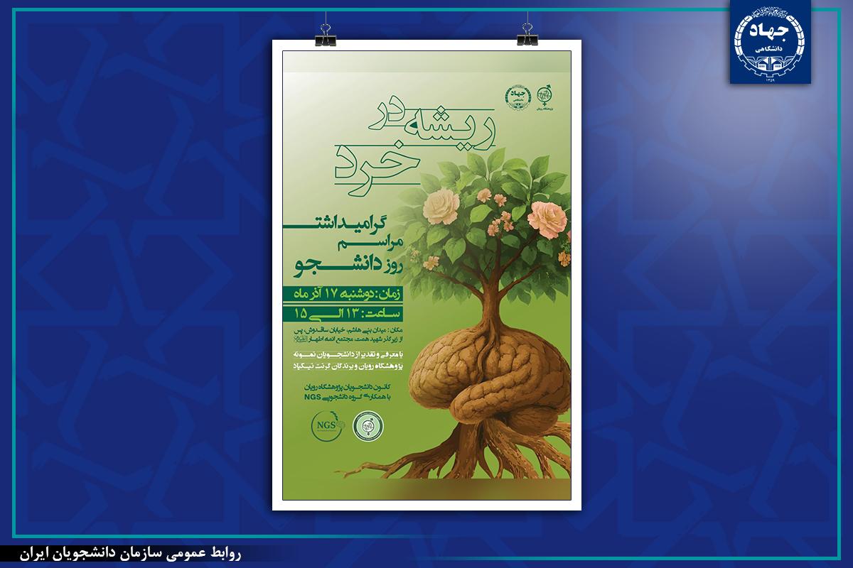 به گزارش روابط عمومی سازمان دانشجویان ایران، پژوهشگاه رویان جهاددانشگاهی مراسمی با عنوان «ریشه در خرد» برگزار میکند. این برنامه روز دوشنبه ۱۷ آذرماه از ساعت ۱۳ تا ۱۵ با حضور دانشجویان، استادان و مسئولان پژوهشگاه برگزار خواهد شد.در این آیین، ضمن تقدیر از دانشجویان نمونه پژوهشگاه رویان، از برندگان گرنت پژوهشی «نیکپاد» نیز تجلیل بهعمل میآید. این مراسم توسط کانون دانشجویان پژوهشگاه رویان و با همکاری گروه دانشجویی نسل آینده دانشمندان (NGS) تدارک دیده شده و شامل بخشهای متنوع فرهنگی، علمی و تقدیر از برگزیدگان خواهد بود.