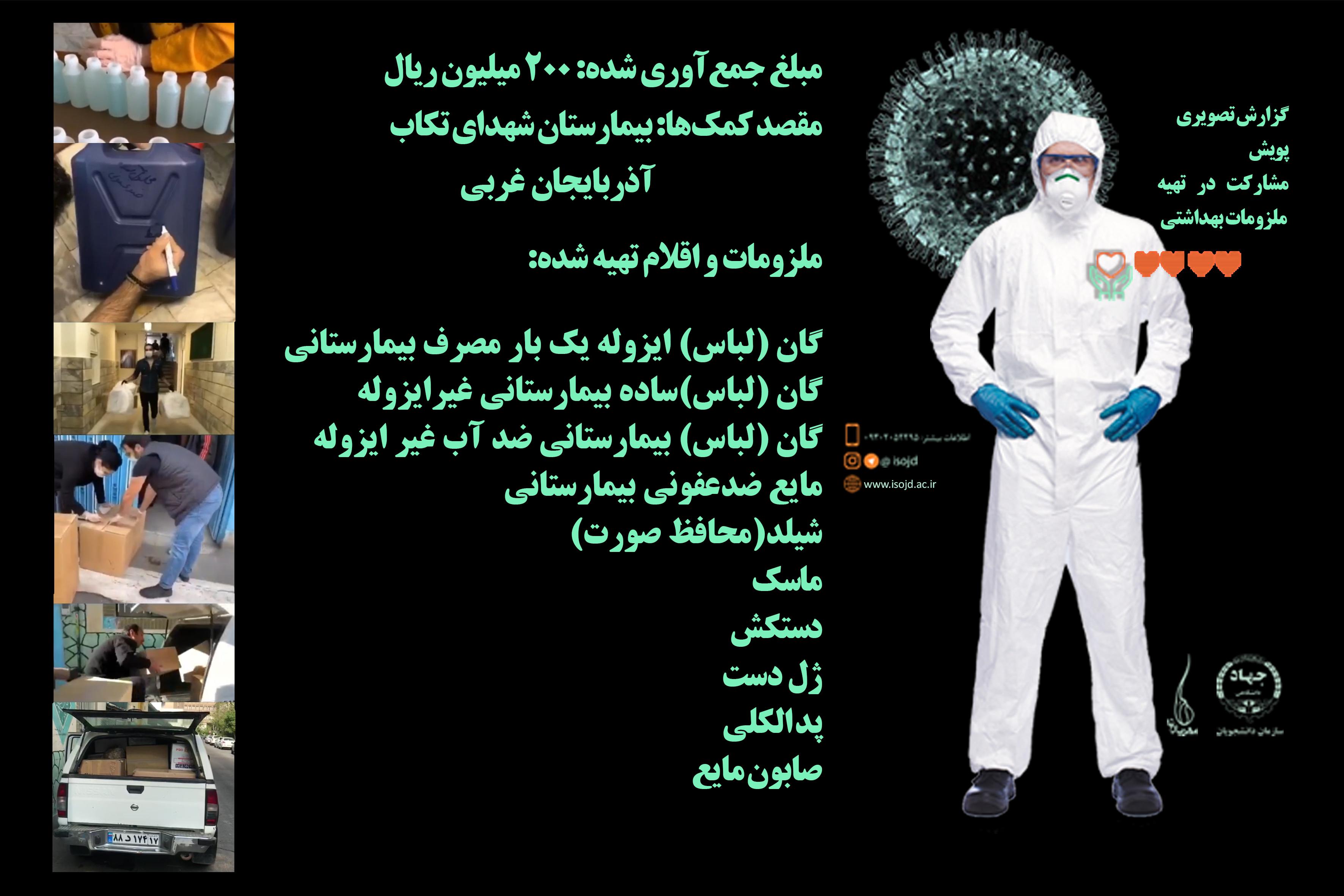 پویش مشارکت در طرح تهیه ملزومات بهداشتی و بیمارستانی از ۲۵ اسفندماه به منظور تهیه و خرید ملزومات بهداشتی و بیمارستایی برای پرستاران و پزشکان در معرض ویروس کرونا توسط سازمان دانشجویان آغاز به کار کرد.